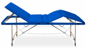 Складной трёхсекционный стол выполнен из экологичных материалов, имеет качественную обивку, которая легко очищается и по характеристикам превосходит даже натуральную кожу, позволяя столу сохранять былой вид даже через много лет, а крепкая конструкция выдержит высокую нагрузку до 200 кг. Это достижимо благодаря использованию при производстве рамы влагостойкой фанеры, а ножек — алюминия. При этом прочность и надежность конструкции выгодно отличают стол от аналогичных моделей. У данной модели есть возможность регулировать высоту от 650 до 900 мм с шагом в 50 мм. Мягкое покрытие стола выполнено из упругого полиуретана, который отлично принимает форму тела и не вызывает дискомфорта. Полиуретан покрыт высококачественной  искусственной кожи, неприхотливой в обслуживании, обладающей высокой износостойкостью и устойчивой к загрязнениям.